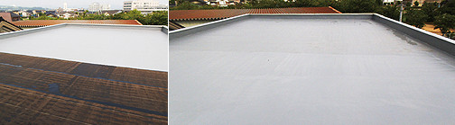 アスファルト防水に比べて、「煙」・「臭気」の発生が少なく、周辺環境等に影響を与えることが少ない為、改修工事に多く採用されています。 防水層が1層及び2層の工法が主流の為、工期が短縮できます。