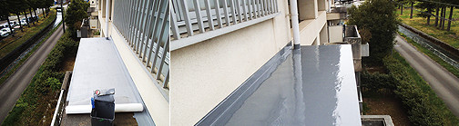 納まりが良いので役物が多い複雑な形状でも施工でき、雨仕舞がやり易いです。カラフルで継目の無い防水層を得ることができます。
