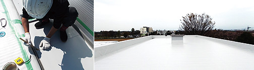 シートの裏面に接着剤を塗布して貼り付けていく工法と機械固定工法があります。溶剤溶着によりシートの接合部が一体化します。